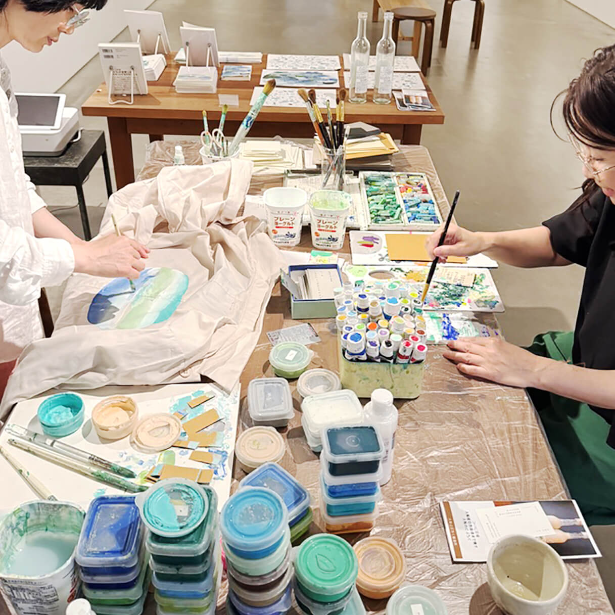 尾柳があなたの持ち物に絵を描くあいだ、様々な紙にアクリルガッシュで面白く絵を描く方法を試していただけます、普段絵を描かない・描けないかたも、よろしかったらご一緒できたらうれしいです